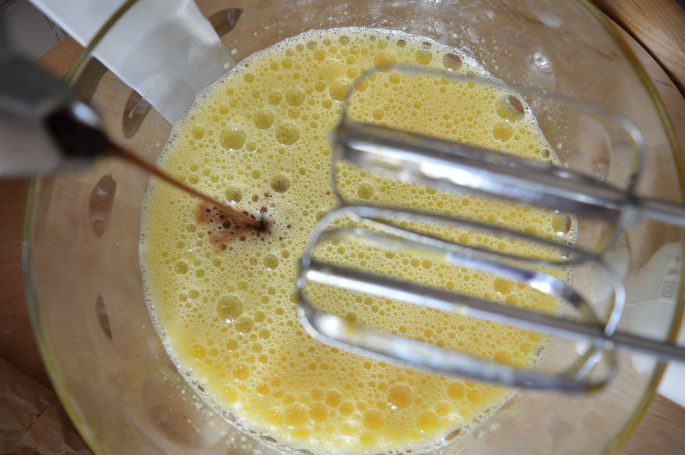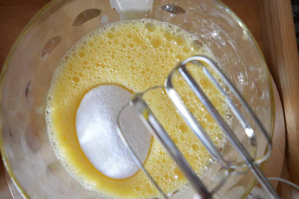 Sgusciare le uova, metterle in una terrina e montarle fino a renderle spumose quindi aggiungere lo zucchero