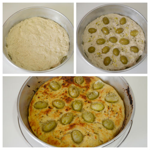 Questa è la focaccia di patate con olive e origano cotta nello stampo rotondo
