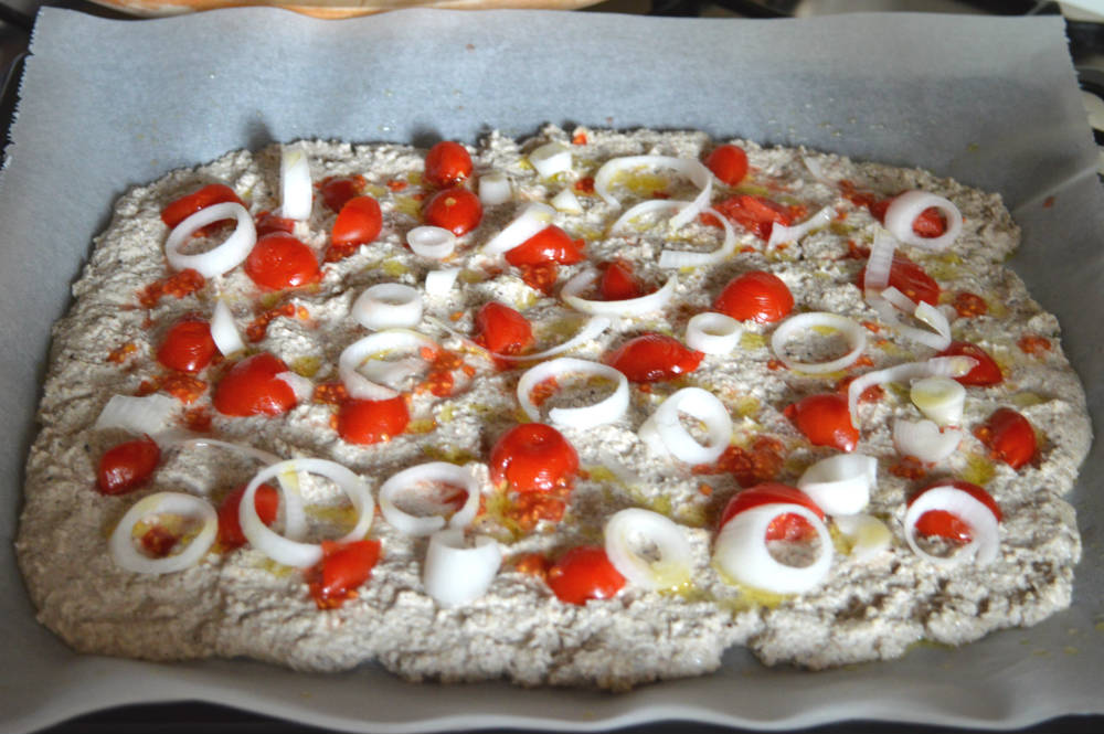 Anche per questo motivo ho scelto per la mia focaccia senza glutine un condimento gustoso ma povero, quale pomodori ciliegino, cipollotti e del buon olio extra vergine d’oliva.