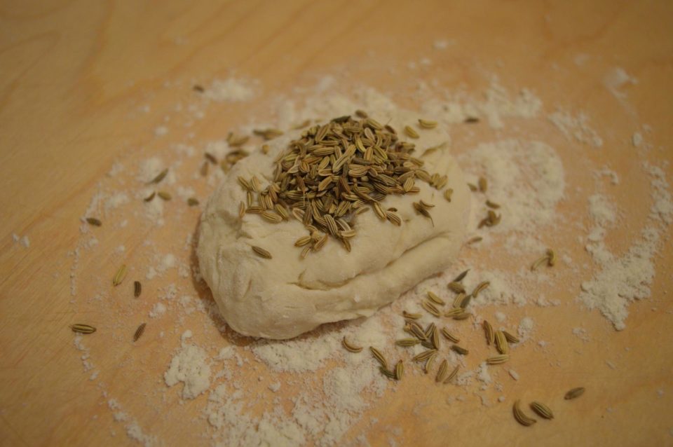 infine aggiungere i semi di finocchio e terminare d’impastare, quindi coprire con una pellicola e lasciar riposare per venti minuti