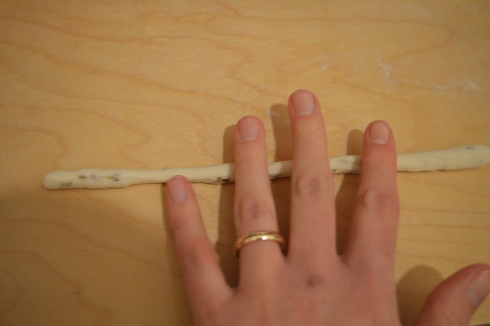 trascorso il tempo di riposo, tagliare dei piccoli pezzi d’impasto e facendoli scorrere con le mani sul piano di lavoro formare dei lunghi cilindri