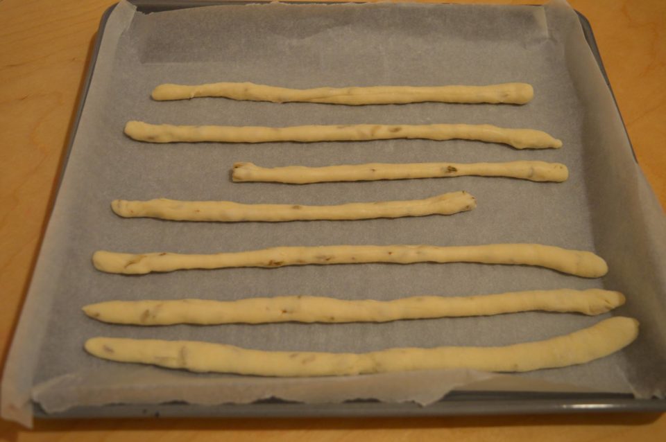 terminare l’impasto formando i grissini in questo modo, cercando di farli tutti di egual misura in modo da rendere omogenea la cottura e posizionarli su una teglia rivestita con carta forno