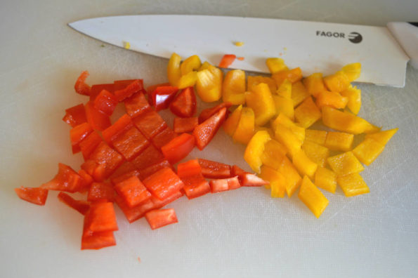 Lavare i peperoni, eliminare il piccilo, tagliarli a metà ed elimnare i semi e filamenti interni, quindi tagliarli in piccoli pezzi possibilmente di egual misura per avere così una cottura omogenea