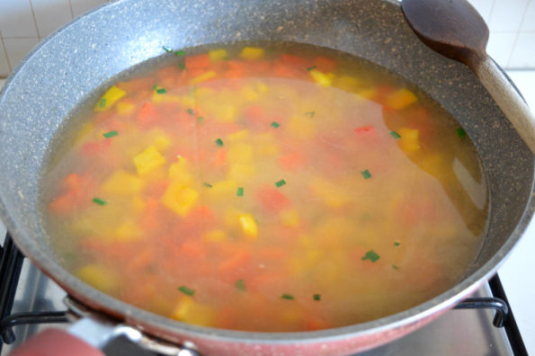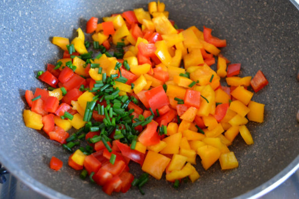 porre i peperoni e l’erba cipollina appena preparati in una padella capiente insieme all’olio