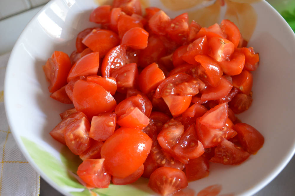 Lavare i pomodori e tagliarli in piccoli pezzi
