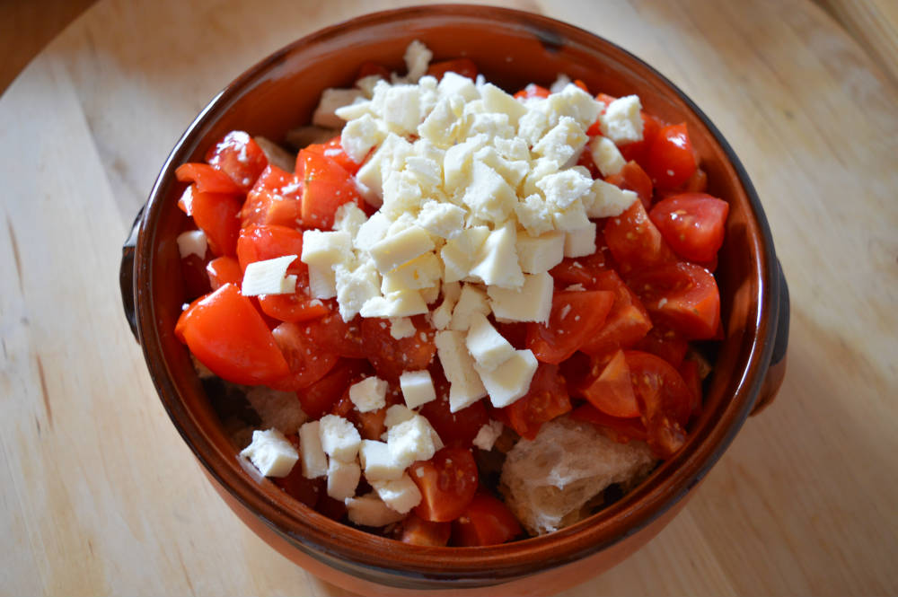 ridurre il cacioricotta in piccoli pezzi e unirlo insieme ai pomodori al pane