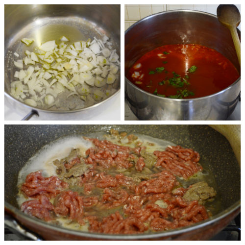in una padella mettere l’olio e la carne macinata, far rosolare e sfumare con il vino, regolare di sale e portare a cottura,