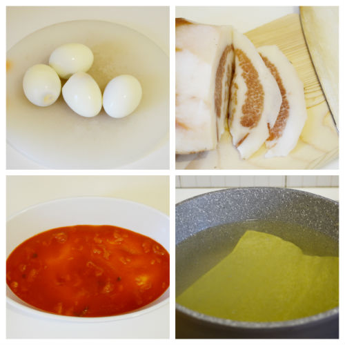 quando il sugo sarà cotto sbucciare e tagliare a fettine le uova sode e affettare finemente anche il guanciale,