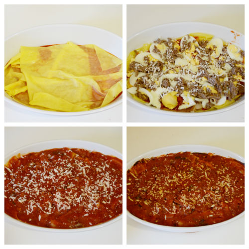 condire in superficie con un po’ di macinato, abbondante sugo e formaggio grattato,
