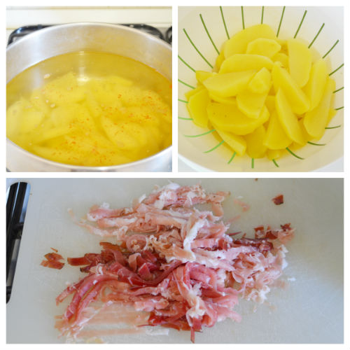 nel frattempo preparare il condimento, sbucciare quindi le patate, affettarle grossolanamente e cuocerle per tre minuti in acqua bollente aromatizzata con la paprika, a cottura toglierle dall’acqua e farle sgoccialare,