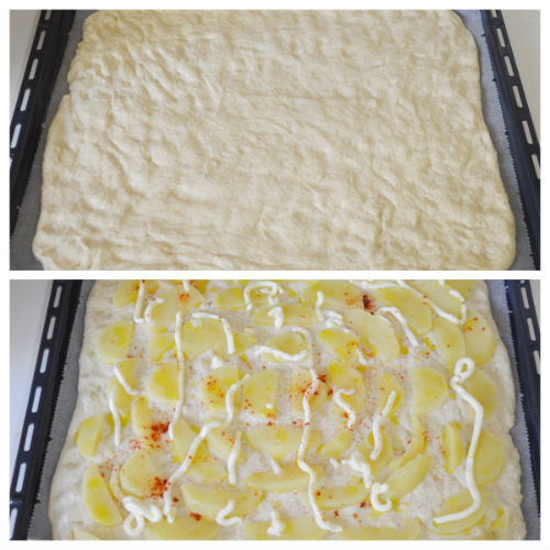 rivestire una teglia con carta forno, ungerla con olio evo aggiuntivo e spianare al suo interno l’impasto allargandolo pian piano con i polpastrelli,
