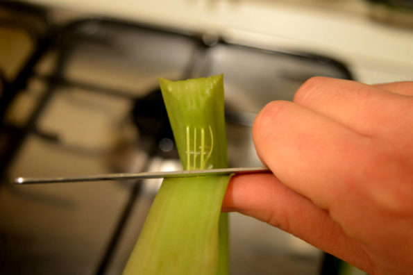 Recidere l’estremità e dividere quindi la piantina in foglie, con un coltello recidere poi una piccola parte di gambo e sfilarla via verso l’estremità della foglia