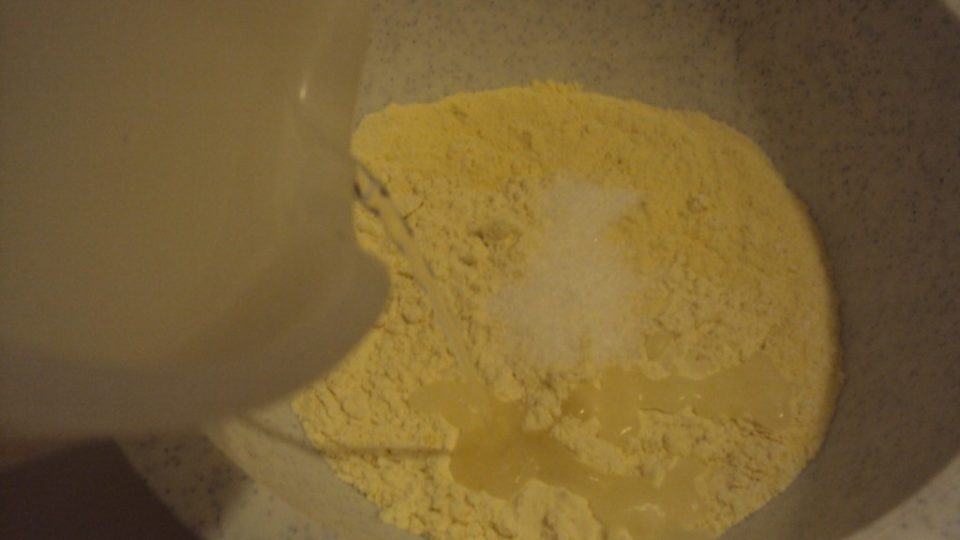 pesare la farina e il sale e metterli in una capiente ciotola, quindi versare lentamente l’acqua e iniziare ad impastare