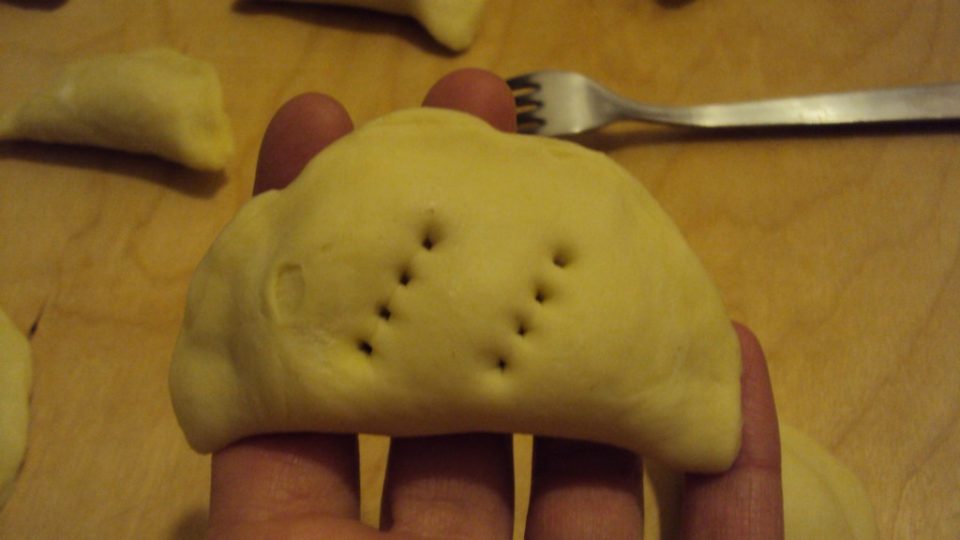 bucare i calzoncini al forno senza lievito con i rebbi di una forchetta