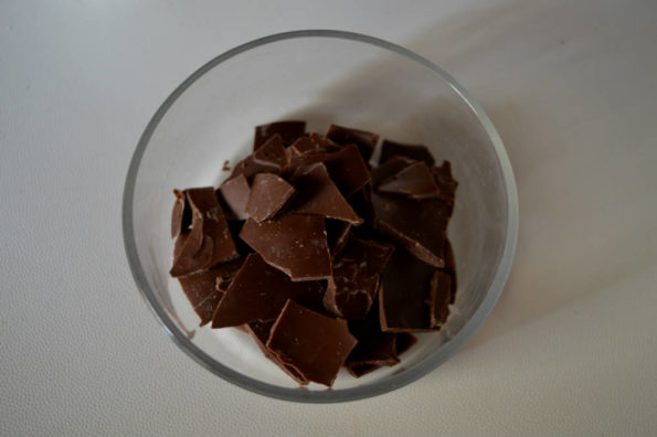 Spezzettare ottanta grammi di cioccolato, porlo in una terrina e scioglierlo a bagnomaria o nel microonde