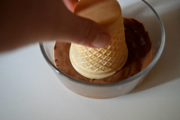 prendere ora la cialda e immergerla nel cioccolato sciolto in modo da ricoprire il suo bordo