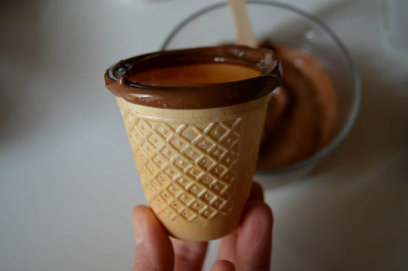 Vi consiglio di bordare i bicchieri di cialda con il cioccolato e di preparare la crema anche con un po’ d’anticipo; così poco prima di servirli non vi resterà che farcire le cialdine, evitando quindi che le stesse si inumidiscano e perdano la loro croccantezza.
