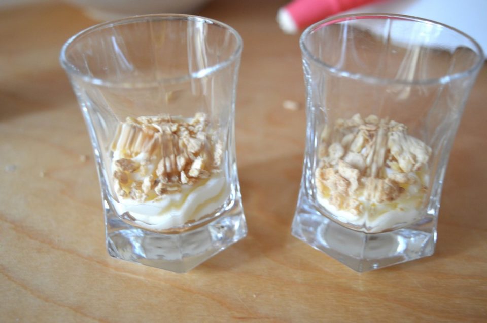 trasferire la crema in una sac a poche con bocchetta a stella, quindi coprire il fondo delle coppe con la crema e aggiungere i cereali sbriciolati
