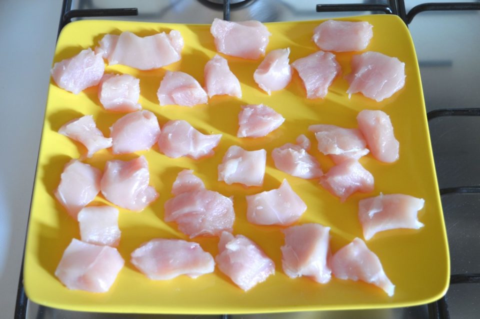 Eliminare prima eventuali ossa e poi tagliare con un coltello liscio il petto di pollo in piccoli rettangoli spessi un centimetro