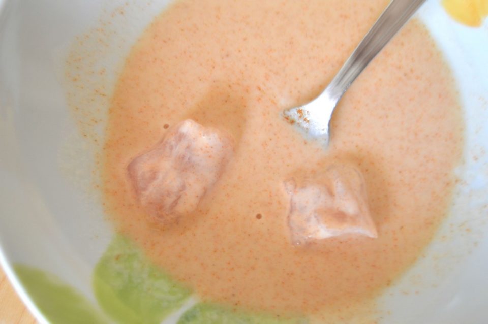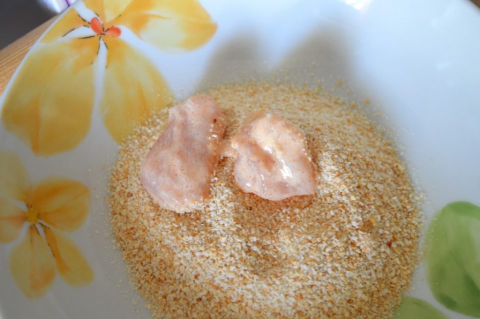mescolare ottenendo una pastella liscia, quindi passarci dentro i pezzetti di pollo avendo cura di bagnarli in modo omogeneo