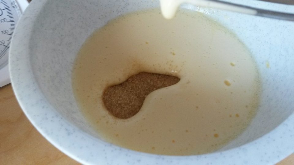 montare le uova con un frustino elettrico per circa cinque minuti, quindi aggiungere lo zucchero