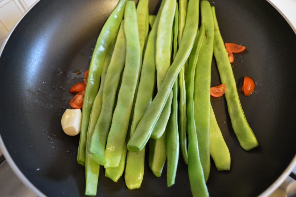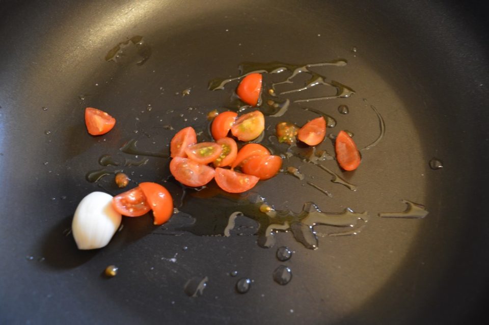 sbucciare l’aglio, lavare i pomodori e tagliarli in piccoli pezzi e unirli in una padella capiente insieme ad un filo d’olio