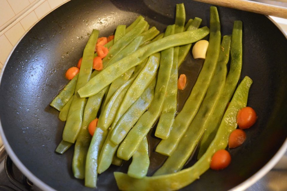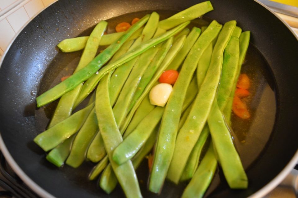 aggiungere le taccole in precedenza lavorate e cuocere a fuoco medio per quattro minuti mescolando spesso, quindi coprire d’acqua e regolare di sale