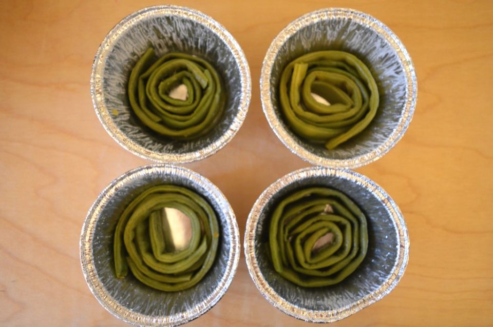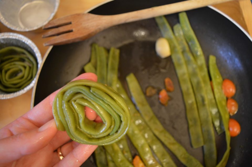 Arrotolare quattro taccole su loro stesse e metterle nel pirottino