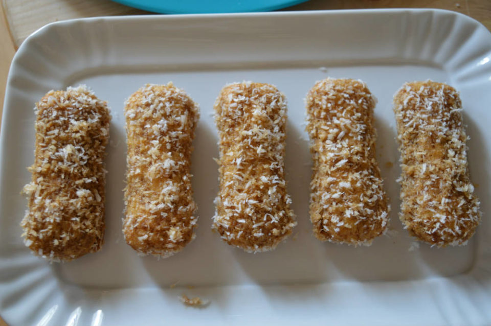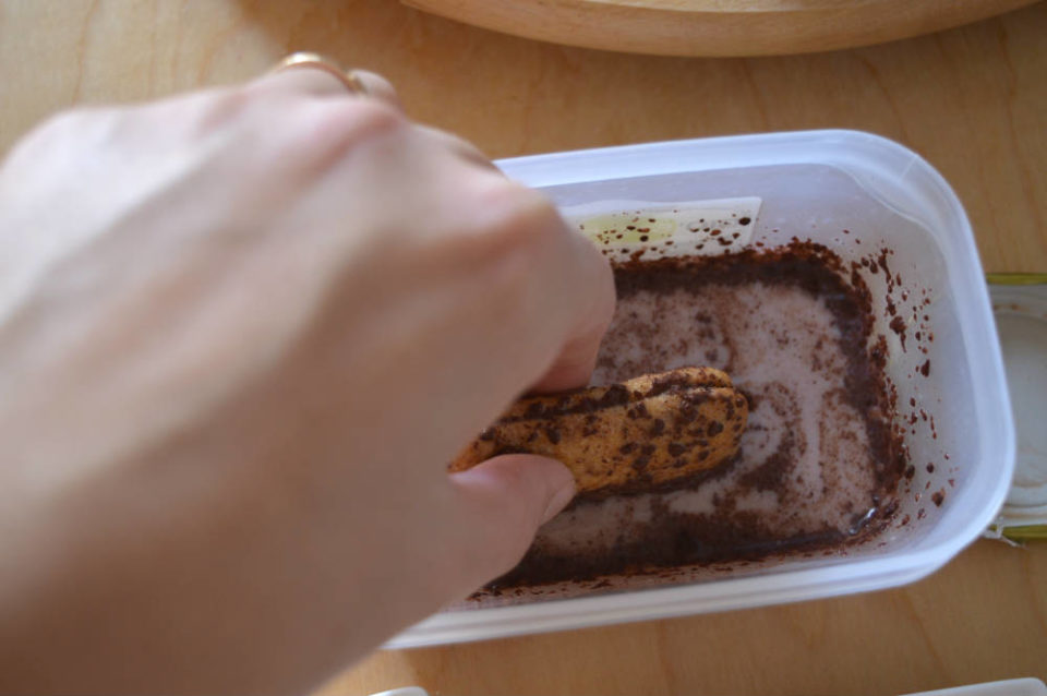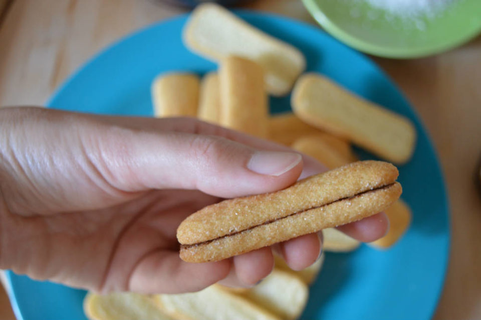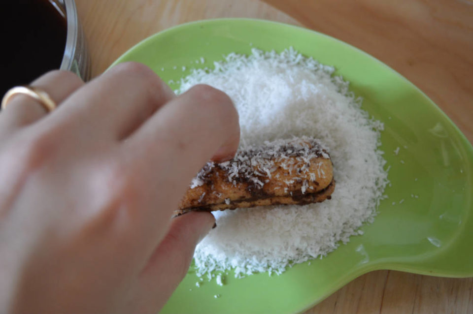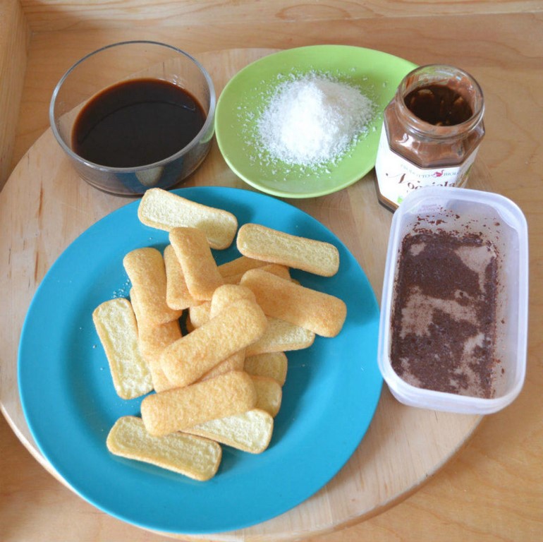 I Pavesini con cocco e crema di nocciole, dopo essere stati farciti con la crema di nocciole, vengono inzuppati nel caffè e poi passati del cocco disidratato e riposti in frigorifero fino al momento di servirli; per non far mangiare ai bambini quelli con il caffè, ho preparato anche una bagna con latte e cioccolato.