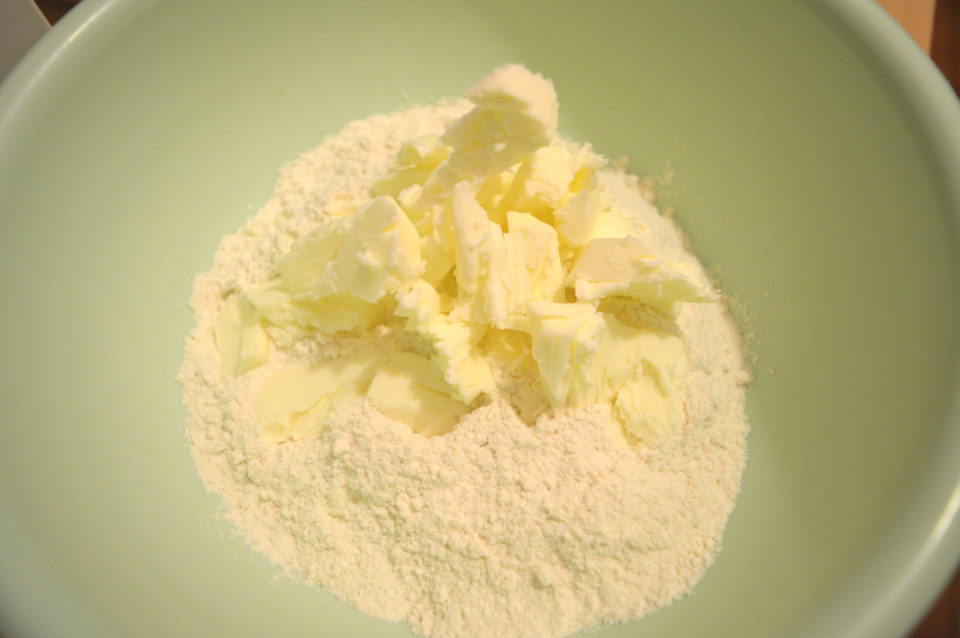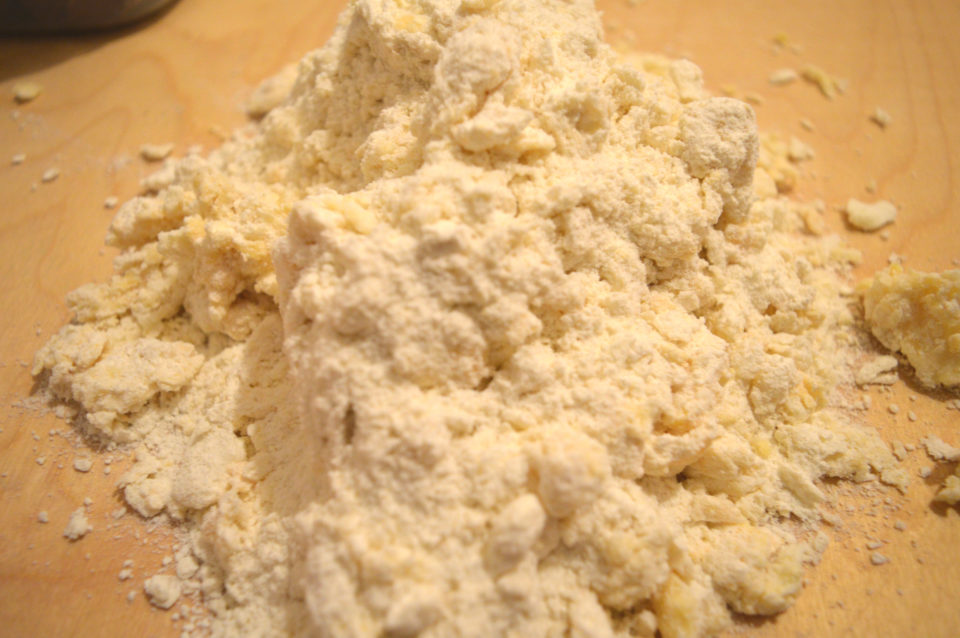 Far stiepidire il burro fuori dal frigorifero per circa mezz’ora, quindi spezzettarlo e unirlo alla farina in una capiente ciotola