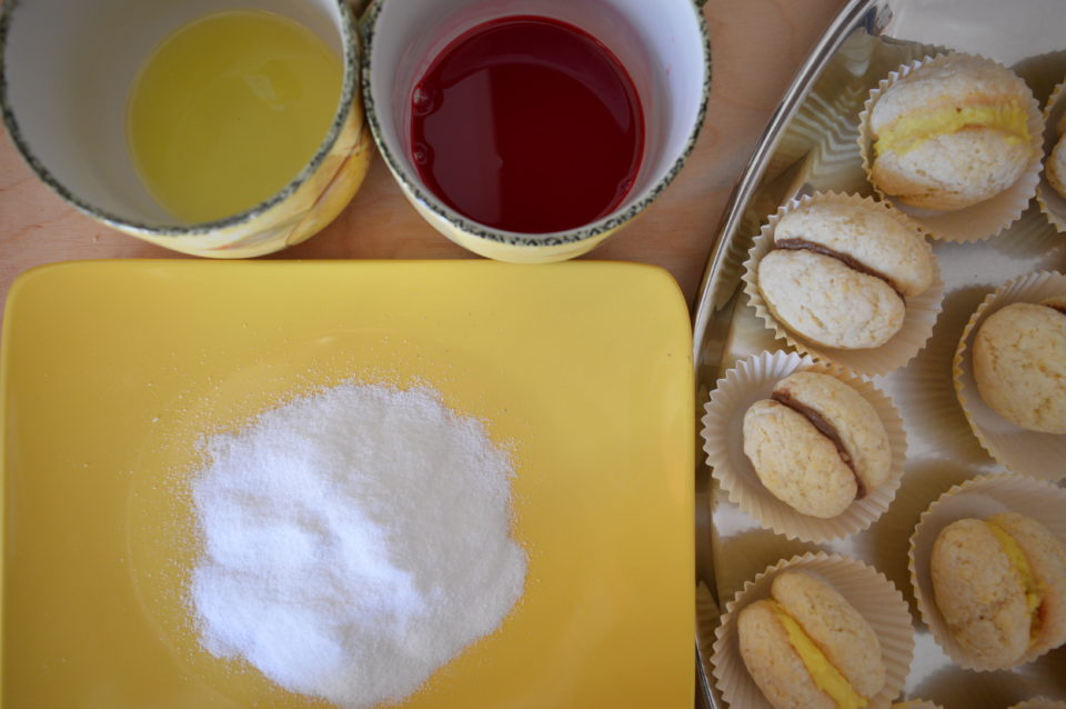 dopo aver farcito tutti i gusci immergere metà dolce nella strega e l’altra metà nell’alchermes, quindi rotolarli nello zucchero semolato facendolo aderire su tutta la superficie delle pesche dolci e riposizionarli nel pirottino