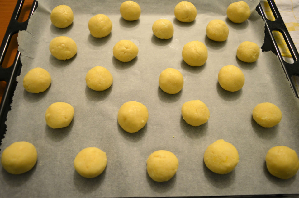 Riprendere l’impasto e formare, facendolo roteare fra i palmi delle mani, delle palline della stessa grandezza grandi quanto una noce e posizionarle sulla carta forno ben distanziate fra loro perché in cottura lieviteranno