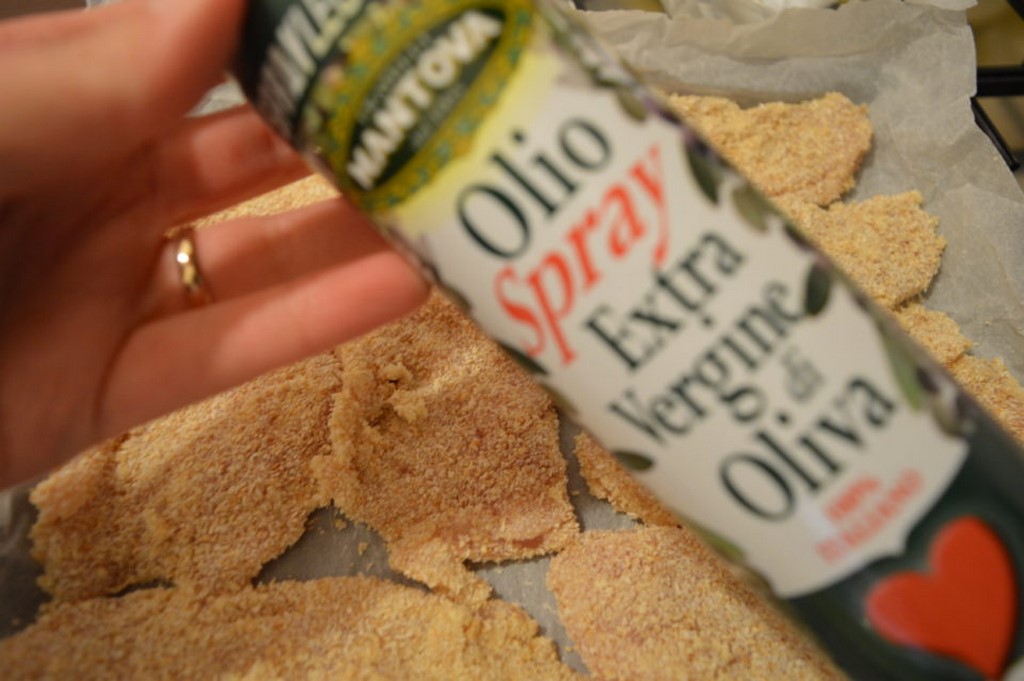 adagiare le fette di pollo panate nella teglia e irrorarle con un filo di Sprayleggero olio evo