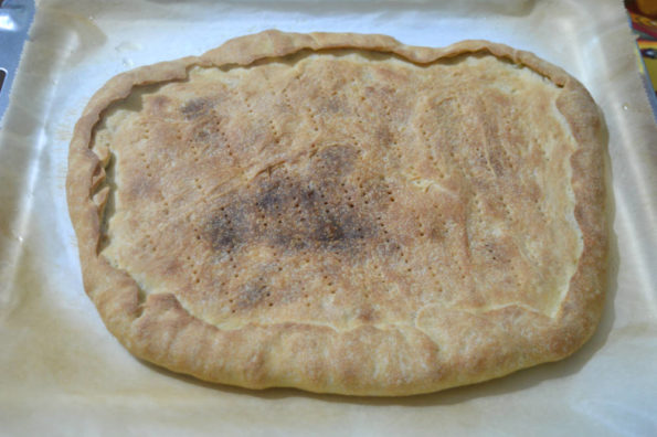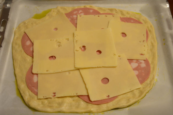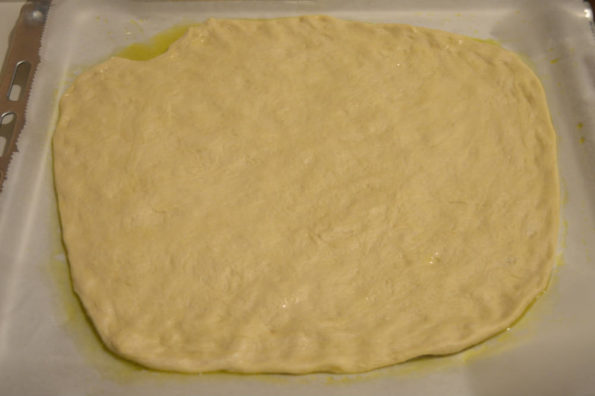 foderare una teglia con la carta forno, oliarla con dell’olio aggiuntivo e porre al suo interno tre/quarti d’impasto spianandolo con le mani