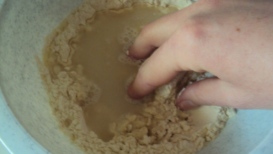 Mettere la farina in una ciotola e versarvi pian piano l’acqua con il lievito e iniziare ad impastare