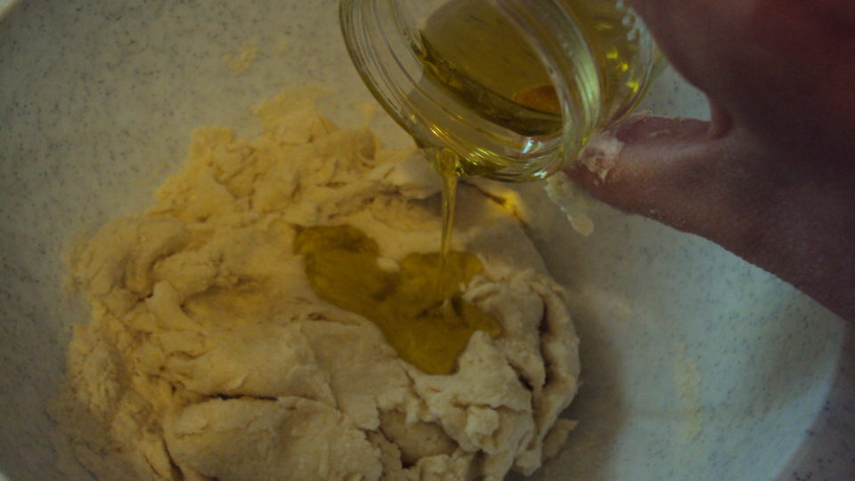 quando l’acqua si sarà assorbita aggiungere l’olio e continuare ad impastare