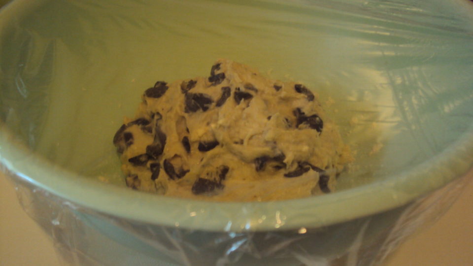 L’impasto risulterà un po’ appiccicoso quindi infarinare il fondo di una ciotola e trasferirlo al suo interno, quindi coprire la ciotola con della pellicola alimentare e poi con un canovaccio, e lasciare lievitare per sette ore preferibilmente nel forno spento con lo sportello chiuso