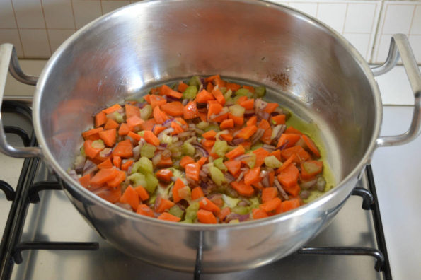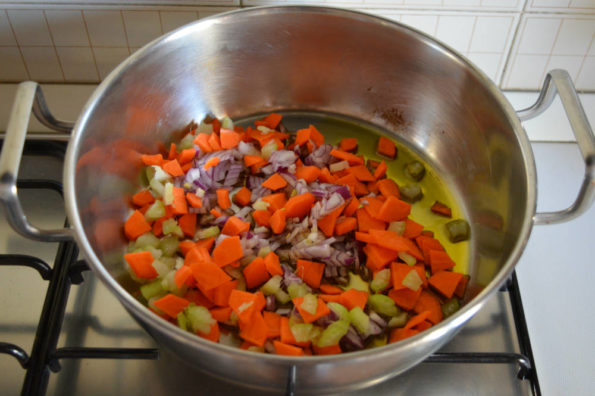 Tagliarli grossolanamente, o tritarli in un robot di cucina se lo preferite, ed unirli in una pentola capiente insieme all’olio