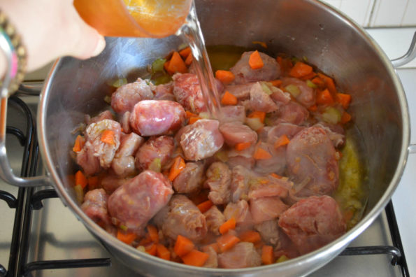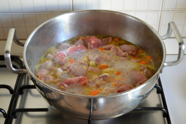 quindi tagliare la salsiccia in più pezzi ed aggiungerla insieme allo spezzatino nella padella, farli rosolare, quindi sfumare con il vino