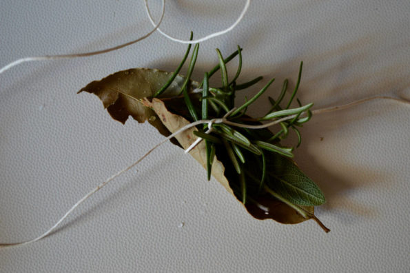 nel frattempo lavare ed asciugare le erbe aromatiche e legarle insieme con uno spago da cucina