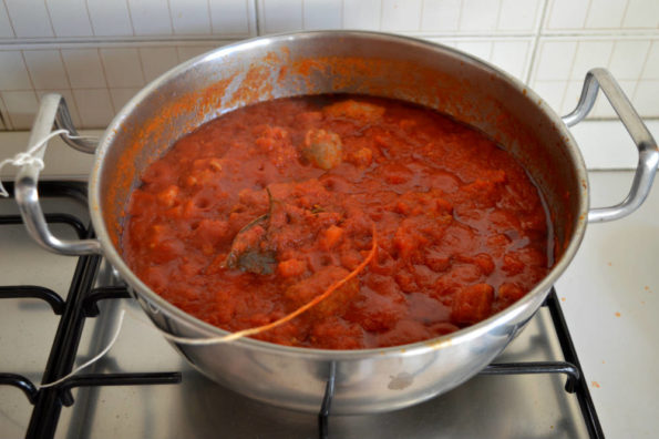 quando il vino sarà evaporato aggiungere il pomodoro, le erbette aromatiche, regolare di sale, aggiungere un po’ d’acqua e lasciar cuocere a fuoco lento per circa tre ore (La quantità d’acqua da aggiungere varia in base a quanto tempo vorrete far cuocere il vostro ragù. Considerate comunque che il ragù più cuoce e più sarà saporito. Solitamente io metto metà dose di acqua rispetto alla quantità del pomodoro. )