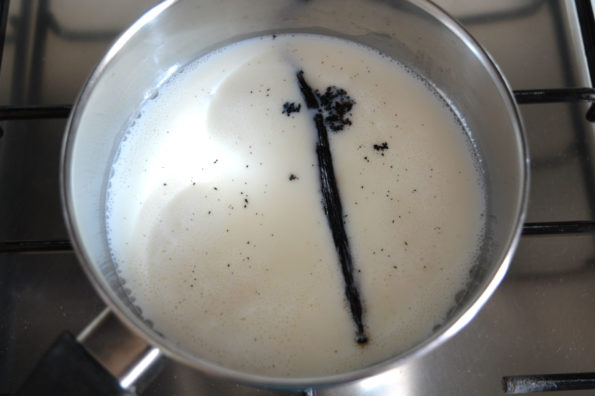 Mettere il latte in un pentolino ed effettuare un taglio per il senso della lunghezza sulla bacca di vaniglia ed estrarre i sui semi