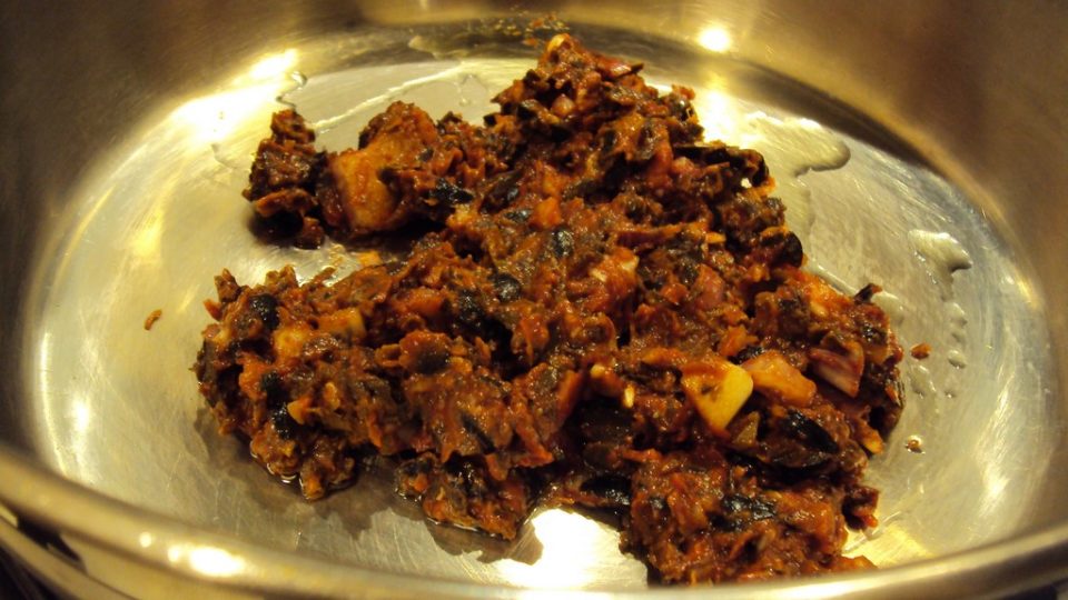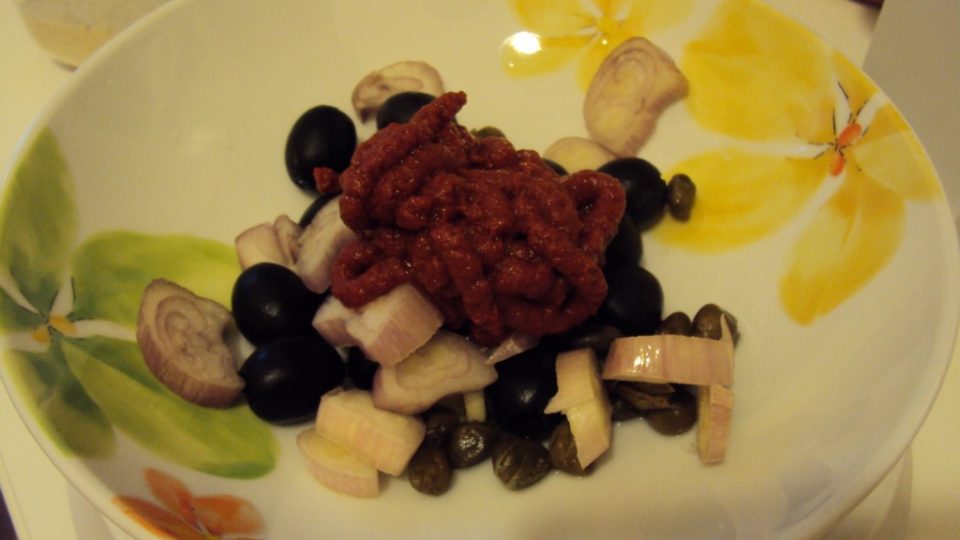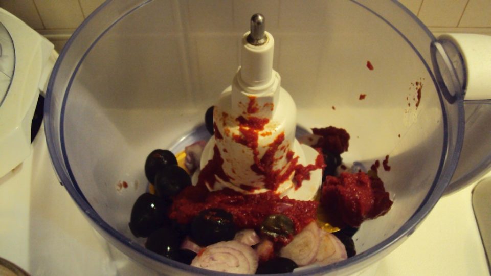 Mettere i capperi, le olive, l’aglio, lo scalogno e il concentrato di pomodoro in un’unica terrina e trasferirli in un mixer per tritarli aggiungendo anche un filo d’olio