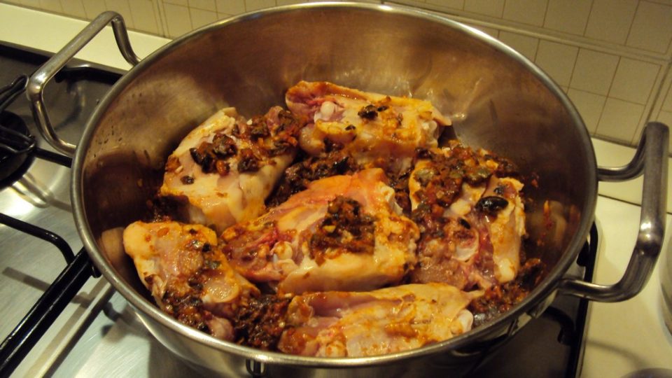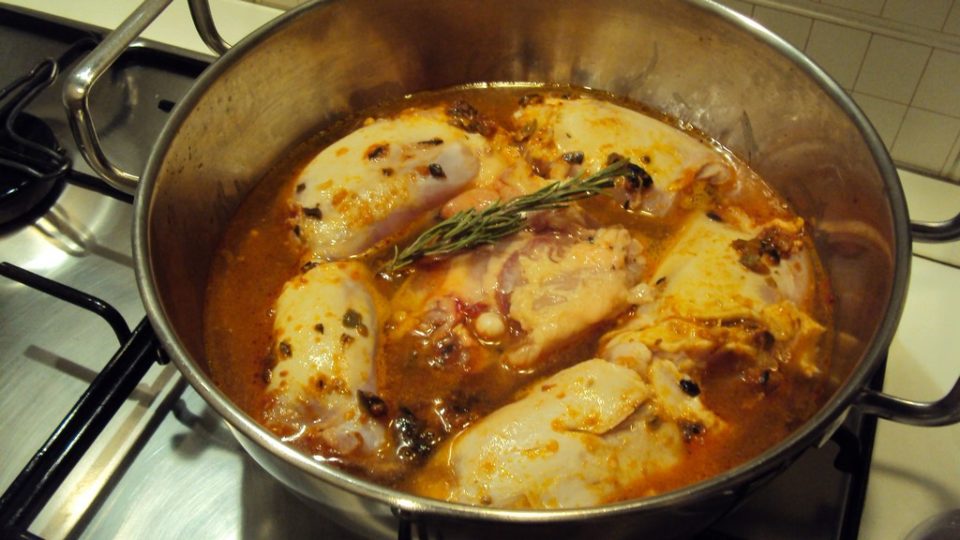 quindi aggiungere l’acqua e il rametto di rosmarino e portare a cottura per altri trenta minuti (il tempo di cottura potrebbe variare in base alla grandezza del pollo, per cui se necessario prolungare il tempo di cottura e aggiungere altra acqua)