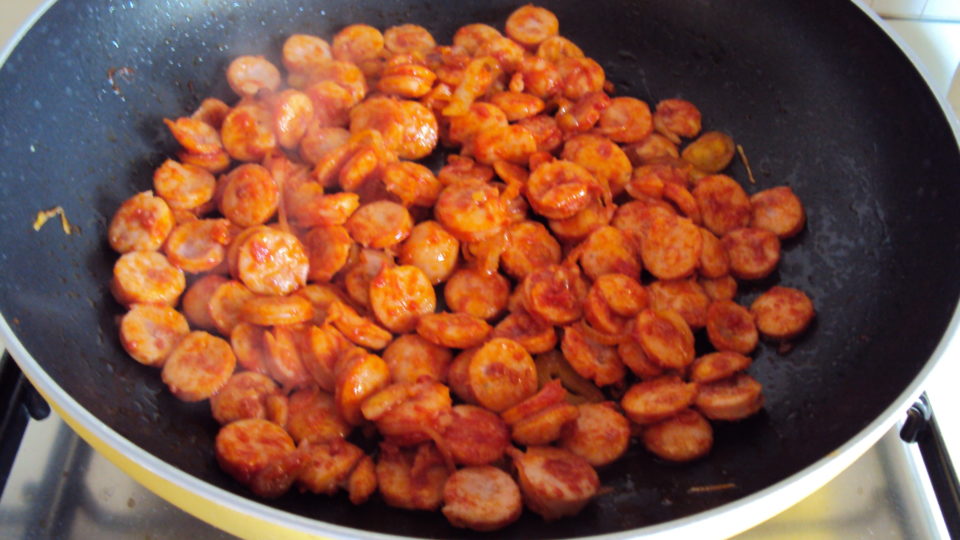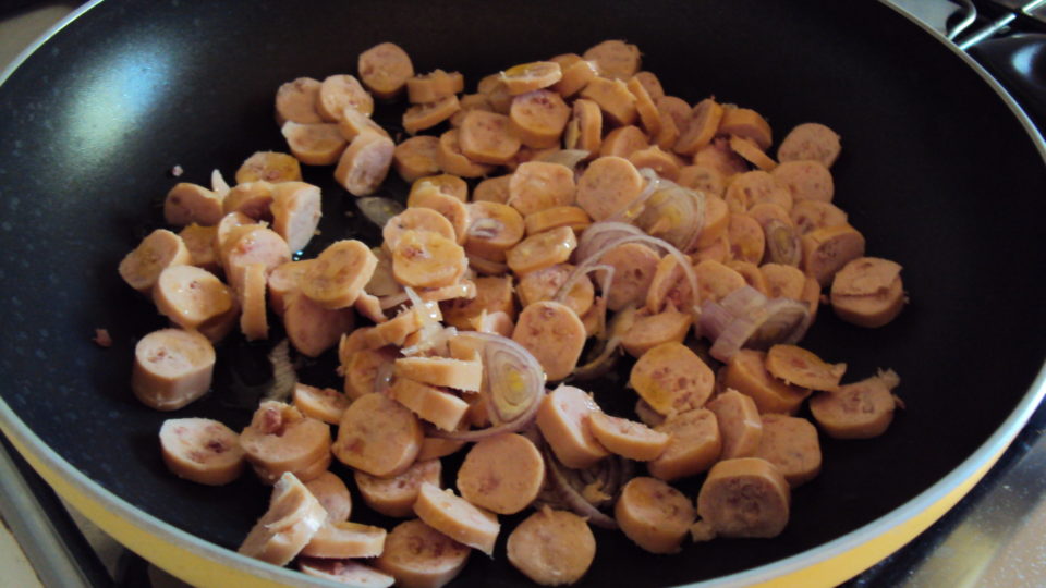 Affettare finemente lo scalogno e i wurstel, e metterli in una padella capiente insieme ad un filo d’olio evo