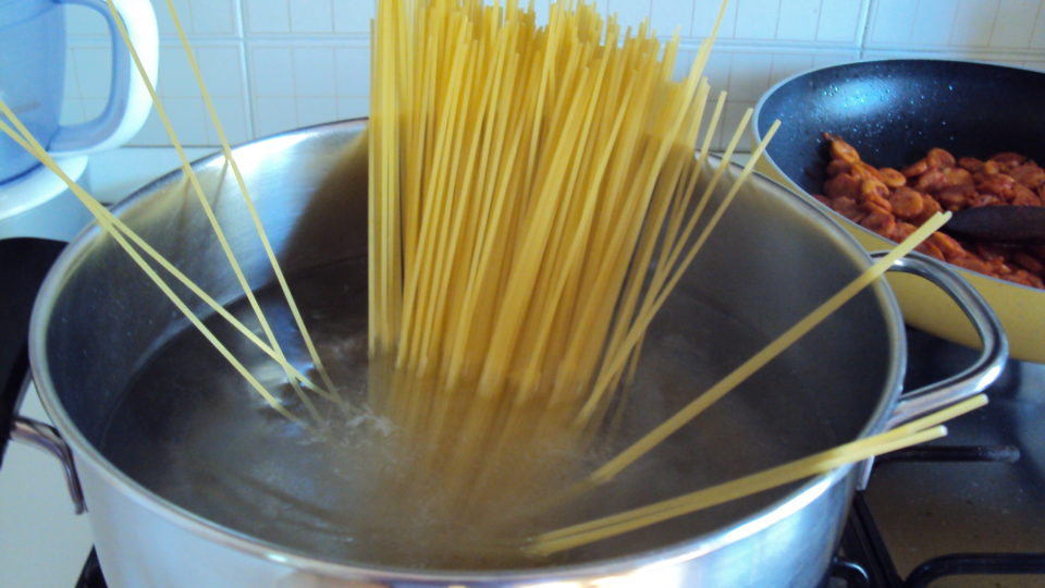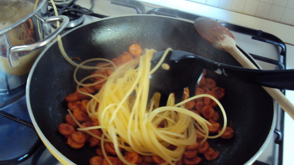Quando gli spaghetti saranno quasi al dente, trasferirli nella padella contenente il condimento tenendo da parte l’acqua di cottura