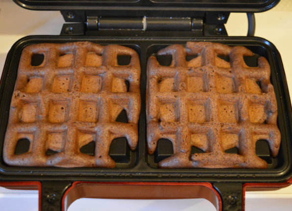 nel frattempo scaldare la piastra e quando sarà ben calda aggiungere tre cucchiaiate d’impasto per ogni waffle e cuocere per circa tre minuti