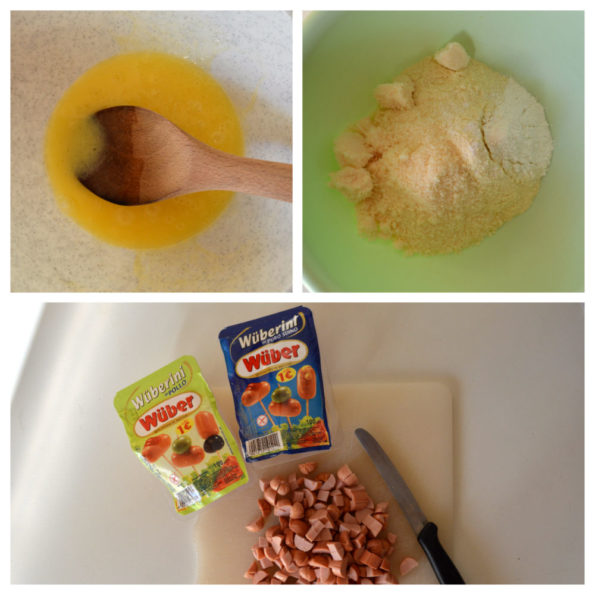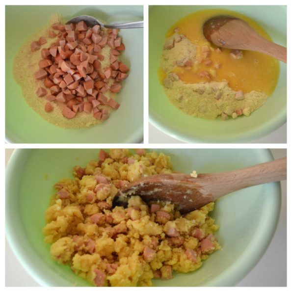 aggiungere i wurstel appena tagliati agli ingredienti secchi e mescolarli insieme,